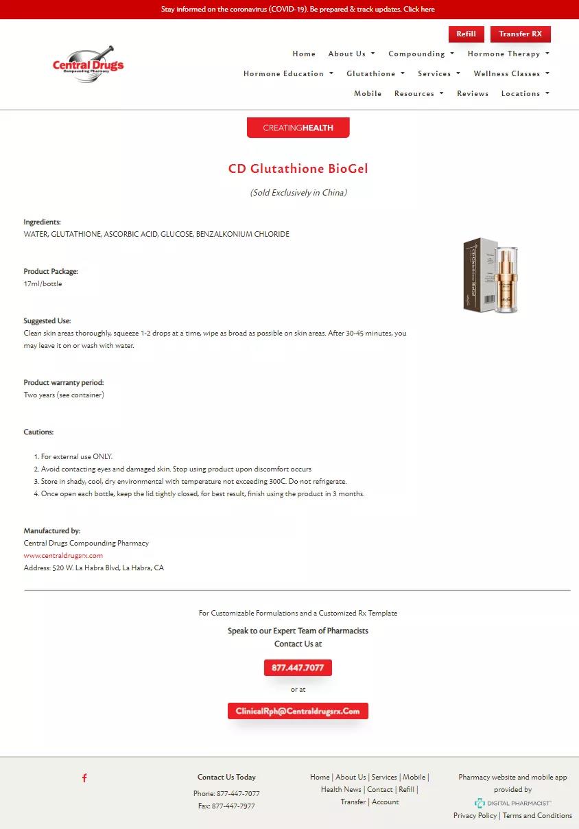 三、我司引进的首博尔谷胱甘肽靓肤凝胶是美国中央配方制药公司唯一在华销售的谷胱甘肽产品,浓度已达饱和,中央制药在美销售的谷胱甘肽制剂仅供药店、诊所专用。