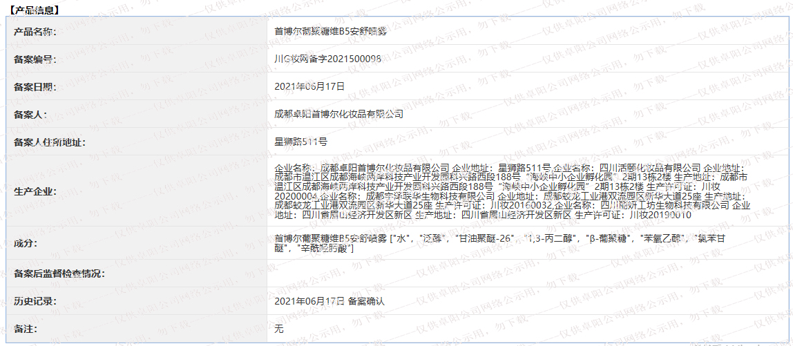 2.1 首博尔葡聚糖维B5安舒喷雾备案信息